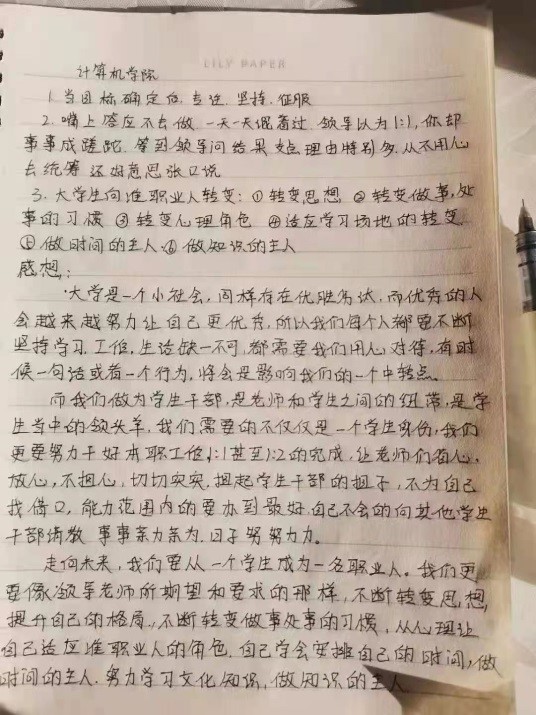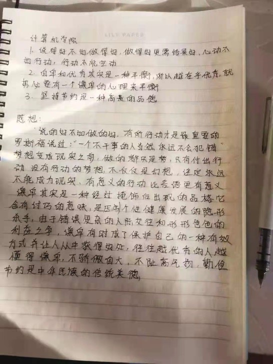 我们深知《习近平谈治国理政》三卷对提升大学生文化素养的重要意义,全体计算机学子静下心来,认真读书,用清晰的笔记记录学习,结合自身感受撰写学习心得,,立足大局大势,明确未来方向,自觉将个人成长与国家事业结合起来。计算机学院20人工智能本科班假期期间积极响应学校号召,学习《习近平谈治国理政》三卷。