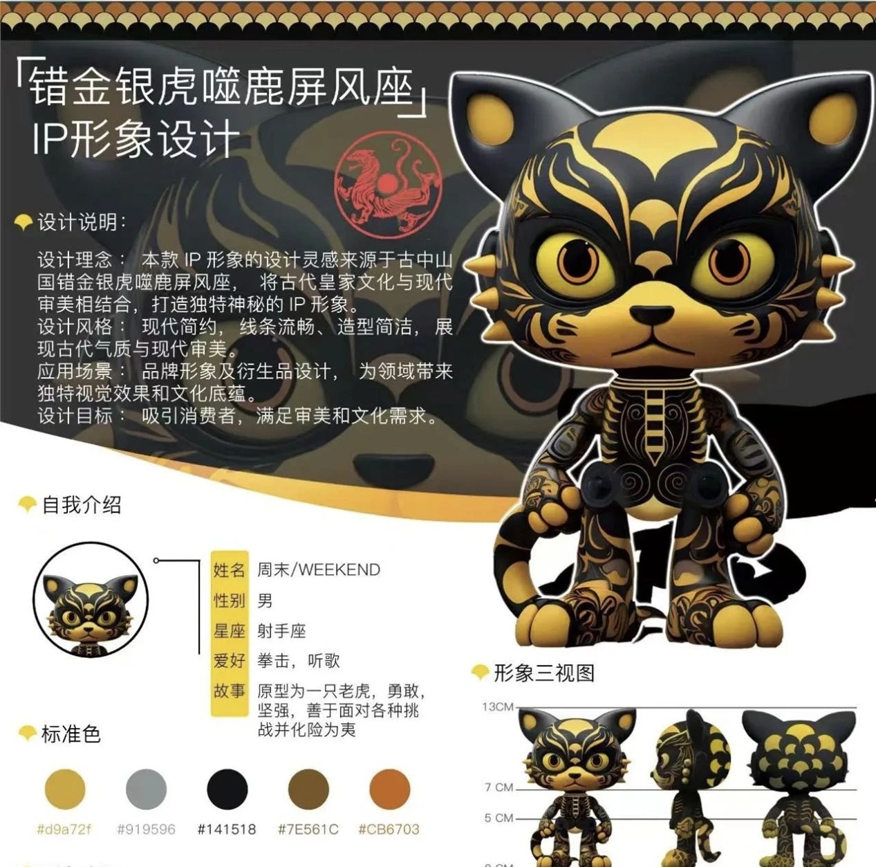 《错金小银虎》是根据河北博物院中的文物,古中山国错金银虎噬鹿屏风座,将古代皇家文化与现代审美相结合,打造的一款独特而神秘的IP形象。该作品不仅在国际各类比赛中获得头筹,同时也获得了国家外观设计专利。