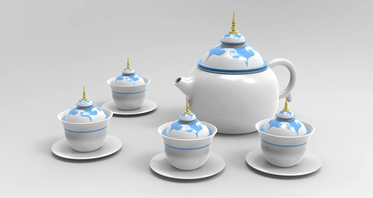 《茶具套装(民族蓝)》作品是根据河北外国语学院民族团结楼的外形而制作的一款茶具。提取了建筑本身的特色,兼具实用性与艺术性,该作品同样获得了国家外观专利设计。