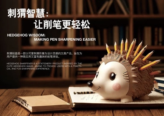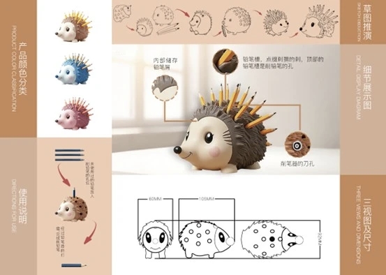 《刺猬的智慧:智能削笔刀设计》作品,源自刺猬造型做的仿生设计,小巧可爱,在第九届米兰设计周-中国高校设计学科师生优秀作品展中荣获国赛一等奖的好成绩。